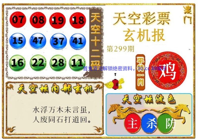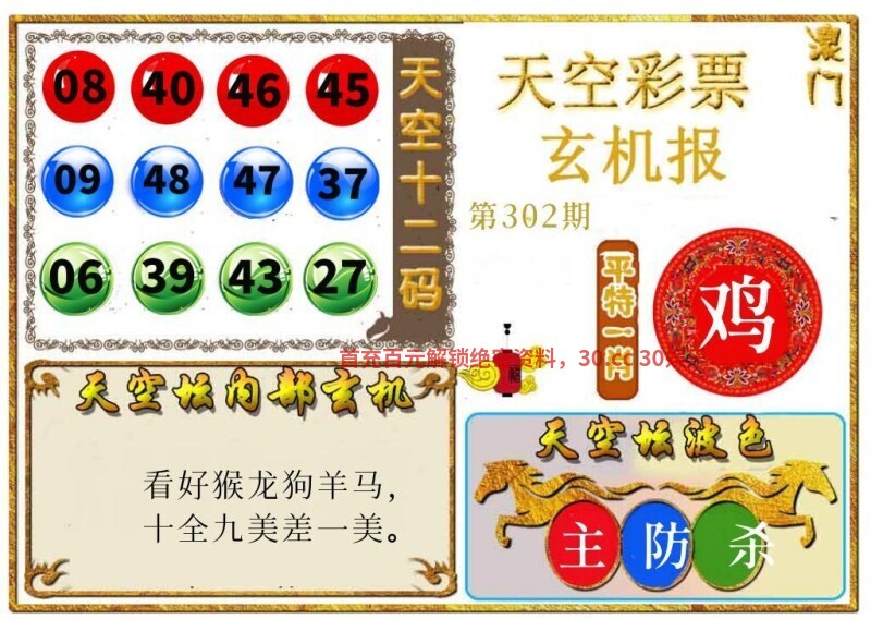 | 302期:天空彩票玄机报 解五肖:鸡鼠猴龙兔 解平肖:鸡鸡鸡 |
